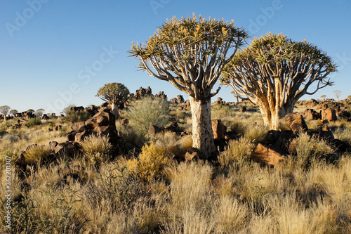 Fototapeta premium Quiver trees (kokerbooms) in bloom at Giants' Playground, Namibia