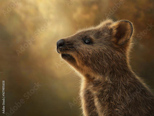 © alsu0112, Fototapeta premium Quokka with soft fur and bright eyes gazes thoughtfully against a blurred golden background, showcasing its adorable features and natural habitat in a serene moment