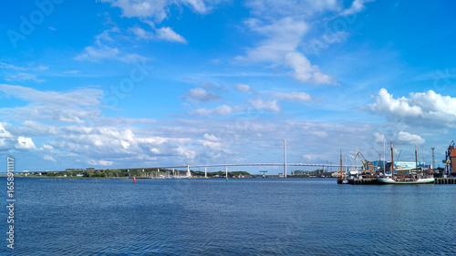 © agrope, Fototapeta premium Rügen Bridge photographed from a distance under a blue sky with few clouds – scenic view of the Baltic Sea connection in Germany.