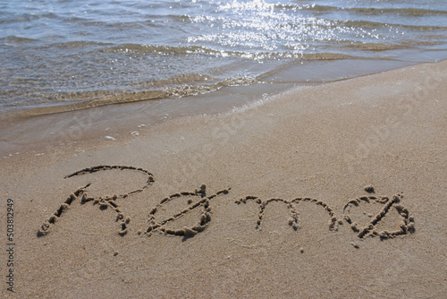 © Lars Gieger, Fototapeta premium Rømø written in the sand at the beach.