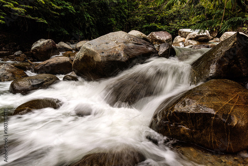 Naklejka premium Río de montaña con aguas blancas y rápidas fluyendo entre grandes rocas. Paisaje natural exuberante en San Rafael, Antioquia, Colombia. La fuerza del agua y la quietud de la piedra en un ecosistema vi