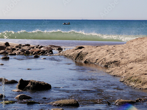 © Alberto Saied, Fototapeta premium Río desembocando en el mar. Olas en el mar. Océano. Cielo azul. Playa. Arena.