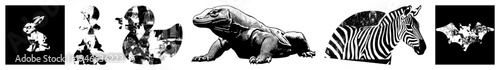 Fototapeta premium Rabbit, abstract figure, Komodo dragon, zebra, bat rendered as bold vector...