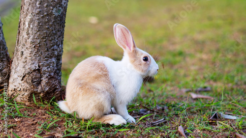 © Panya, Fototapeta premium Rabbit Cute little Easter bunny in the meadow, Green grass under the sunset or sunrise light landscape, Beautiful rabbit on green grass in summer day,easter and animal in the nature concept