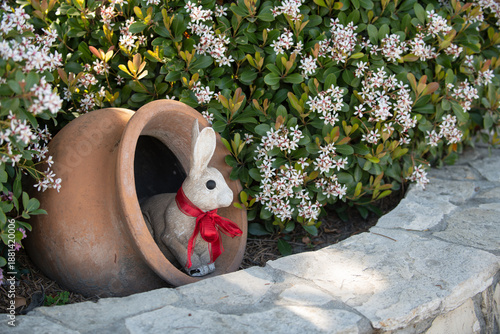 Fototapeta premium Rabbit easter garden decor. Rabbit cute holiday decoration. Rabbit spring...