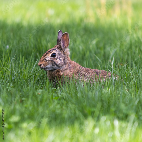 © Carrie, Fototapeta premium Rabbit eating and relaxing in the green grass