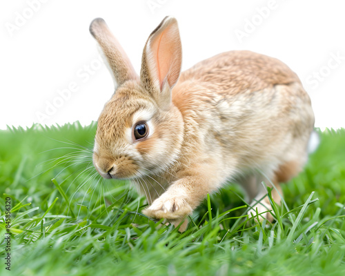 Fototapeta premium Rabbit hopping on the green lawn on transparent background