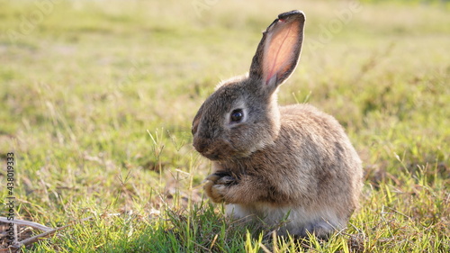 Fototapeta premium Rabbit in green field and farm way. Lovely and lively bunny in nature with...