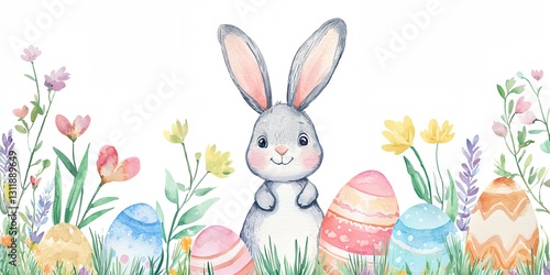 © inspiretta, Obraz premium Rabbit is standing in a field of flowers and eggs.
