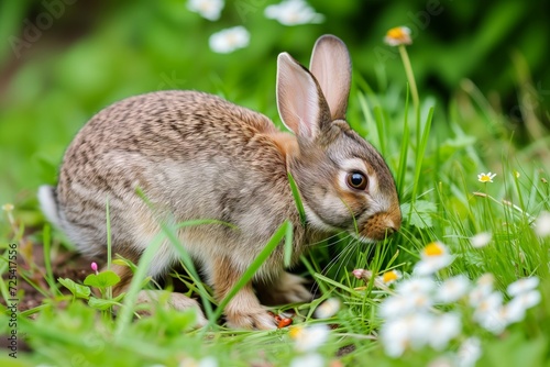 Fototapeta premium rabbit nibbling food, green grass and flowers around