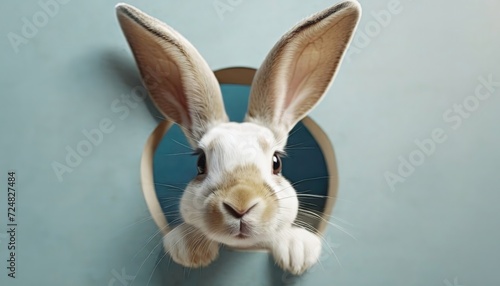 © Juri_Tichonow, Obraz premium Rabbit peeking through a round hole. A curious bunny looking through a circular opening with its ears up and alert