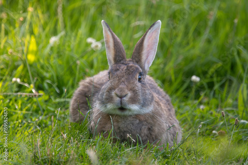 Fototapeta premium Rabbit Sitting in Green Grass at Sunset in Natural Habitat