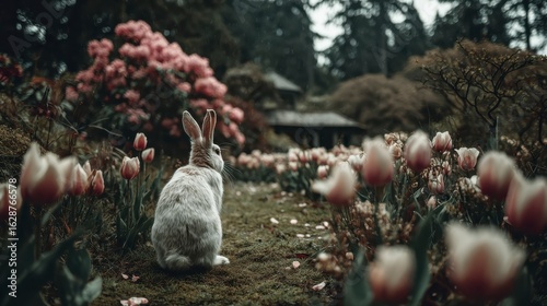Obraz premium Rabbit Strolling Through a Tranquil Garden Surrounded by Blooming Tulips and Pink Flowers in Spring