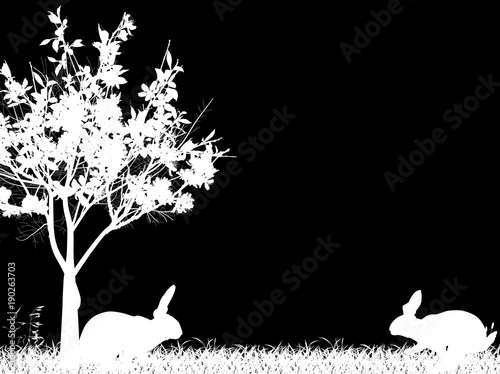 Naklejka premium rabbit white silhouettes in grass near spring blossoming tree