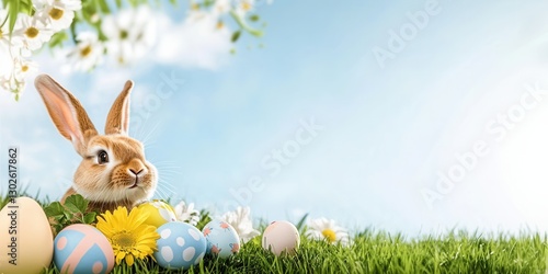 Fototapeta premium Rabbit with colorful easter eggs and flowers in spring field.