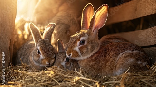 Fototapeta premium Rabbits huddled together in a wooden hutch, sunlit.