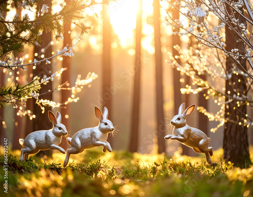 © Abbas, Fototapeta premium Rabbits jump through sunlight forest illustration of spring nature animal