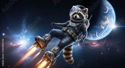 Fototapeta premium Raccoon astronaut soaring through space with earth behind