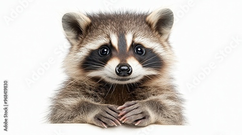 © sa-photo, Fototapeta premium Raccoon holding something in its paws on a white background, detailed and lifelike