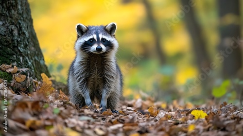 Obraz premium Raccoon in autumn forest cute animal wildlife nature photography outdoor fall season adorable curious mammal wild