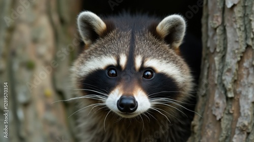 Fototapeta premium Raccoon Peeking from Behind a Tree