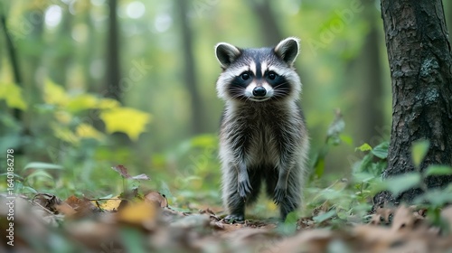 © Muhammad, Fototapeta premium Raccoon portrait in forest wildlife photography cute animal woodland creature nature background adorable mammal
