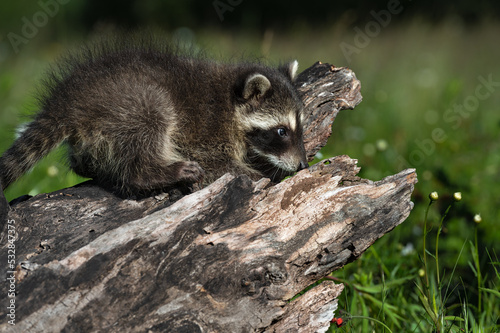 © hkuchera, Naklejka premium Raccoon (Procyon lotor) Investigates Log Summer
