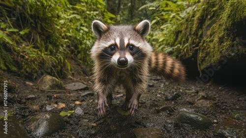 © Imam Soleh, Fototapeta premium Raccoon walking forest stream, mossy background, wildlife documentary