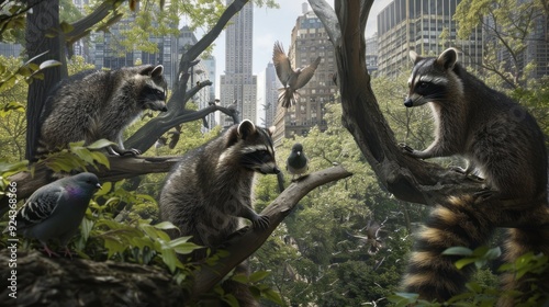 Obraz premium Raccoons and Pigeons in Urban Park.