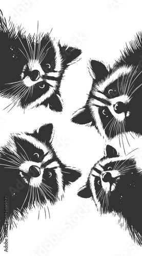 © Oleksandr Pokusai, Obraz premium raccoons peering downward with wide-eyed expressions, ideal for humor or wildlife themes sketch engraving generative ai vector illustration. Scratch board imitation. Black and white image.