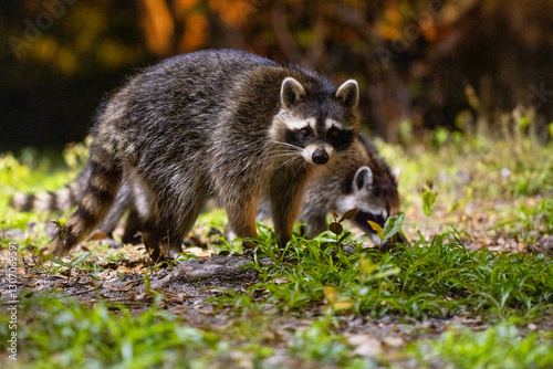 © Hayley Rutger, Obraz premium Raccoons (Procyon lotor) walking through a suburban area at night in Sarasota, Florida