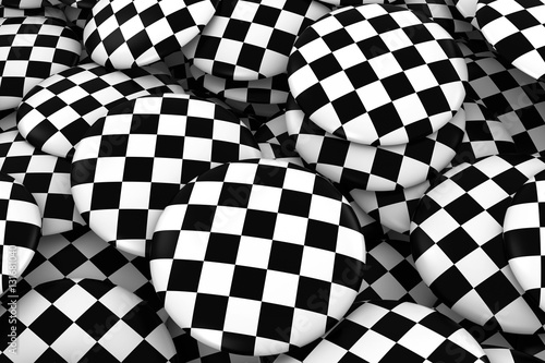 © Fredex, Fototapeta premium Racing Checkers Badges Background - Pile of Checkered Flag Buttons 3D Illustration