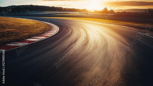 © Bijac, Naklejka premium Racing Circuit Empty Asphalt Track with Dynamic Curves and Professional Racing Line Markings at Golden Hour