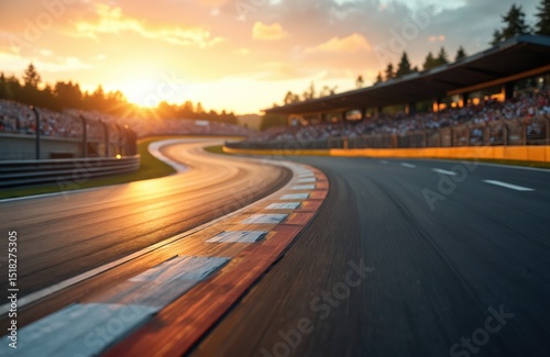 © Pete, Obraz premium Racing track with twisting traffic during golden sunset. Curve road in the stadium with blurred background and bokeh. Concept of race and fast drive. Motorsport auto racing competition. Speed.