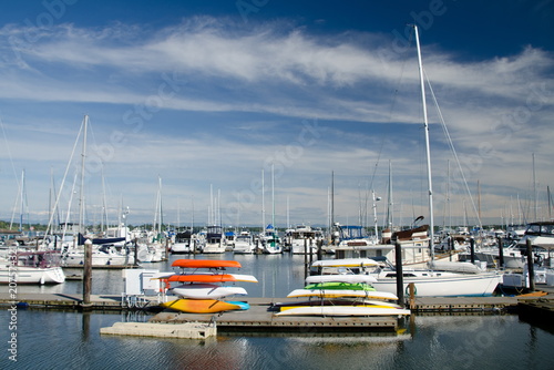 © Dmitri Kotchetov, Naklejka premium Rack of kayaks at Semiahmoo marina