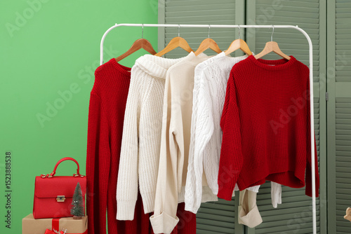 Obraz premium Rack with sweaters in hallway decorated for Christmas