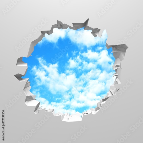 Obraz premium Сracked broken hole in white wall to cloudy sky