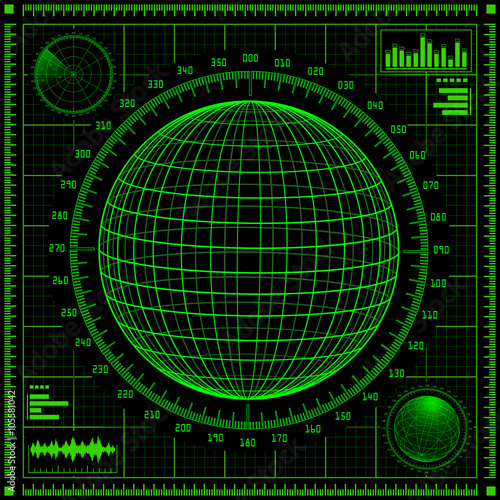 © Makhnach, Obraz premium Radar screen with futuristic user interface HUD.