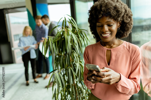 Obraz premium Radiant African American businesswoman engaging in a bright conversation at...