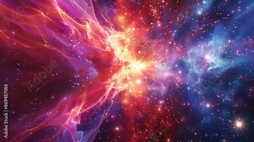 © NUSRAT ART, Naklejka premium Radiant bursts of electric currents depicted through glowing lines intersecting and radiating amidst the celestial spectacle of the universe.