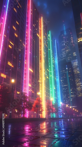 © Bos Amico, Obraz premium Radiant City Skyline with Glowing Rainbow Hued Lights Illuminating the Skyscrapers