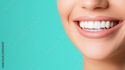 Obraz premium Radiant close-up portrait of a woman with a bright smile and flawless teeth,...