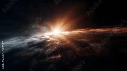 © Bussakon, Naklejka premium Radiant cosmic nebula with bright central light source and swirling stellar clouds representing space explo n and discovery