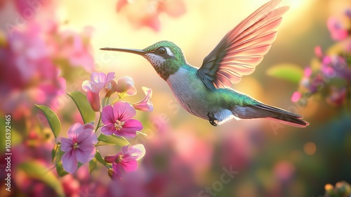 Naklejka premium Radiant 3D Hummingbird with Vibrant Wings Hovering Gracefully Among Soft Pastel Colored Flowers
