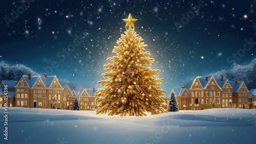© Anak, Naklejka premium Radiant Golden Christmas Tree Illuminating a Snowy Village Square at Night.