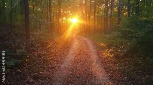 Naklejka premium Radiant golden hour sunbeams illuminating a quiet forest path, nature's glow time, peaceful and inspiring landscape, serene atmosphere.