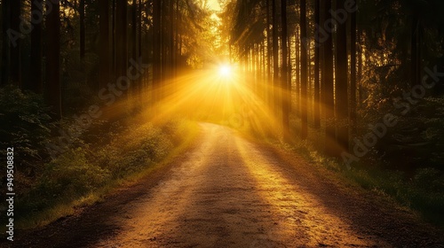 Fototapeta premium Radiant golden hour sunbeams illuminating a quiet forest path, natures...
