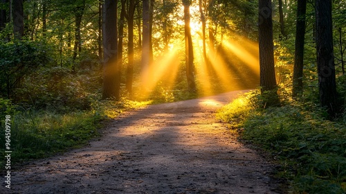 Fototapeta premium Radiant Golden Hour Sunbeams Illuminating Peaceful Forest Path Landscape