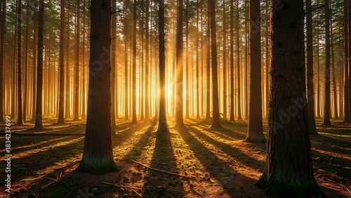 Obraz premium Radiant Golden Sunbeams Pierce Through Serene Pine Forest Casting Long...