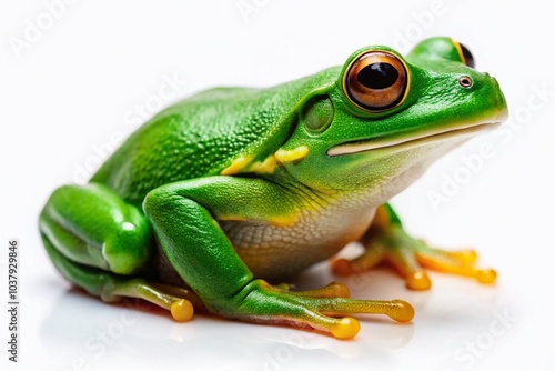 Naklejka premium Radiant green frog on a white backdrop, perfect for nature and wildlife art, highlighting its striking colors and